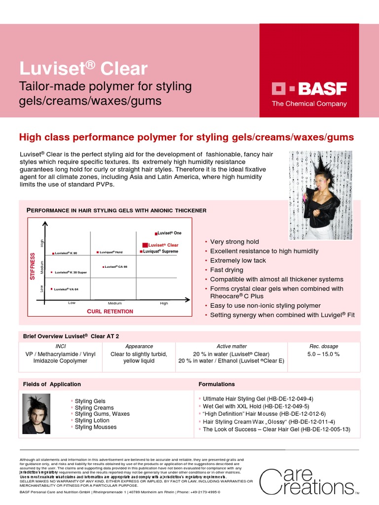 Luviset clear at 2 finds application in formulating brilliantly clear gels mousses styling lotions and alternative styling aids.
